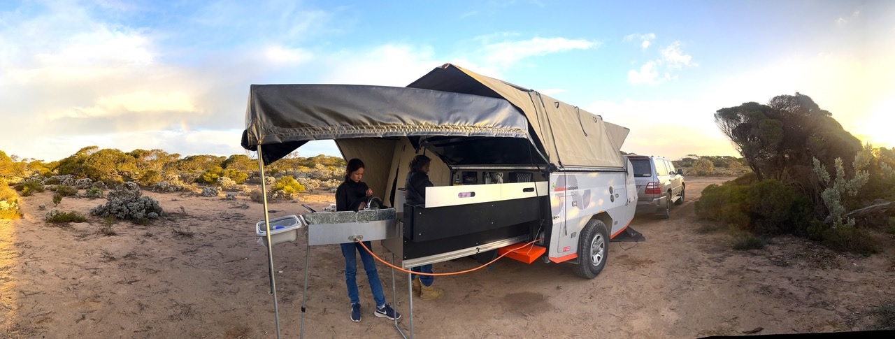 Onboard battery supplies all your 12v needs, Including LED lighting throughout, while an inverter supplies 240v. All this combined with the campers water storage allows for camping anywhere you want to go.