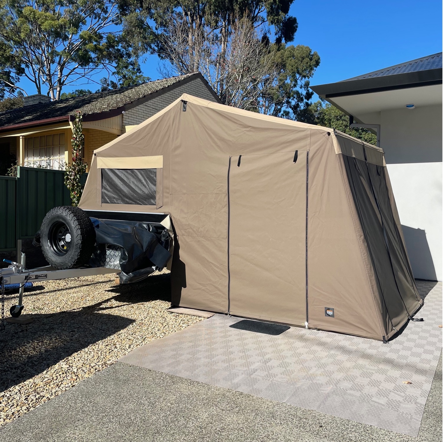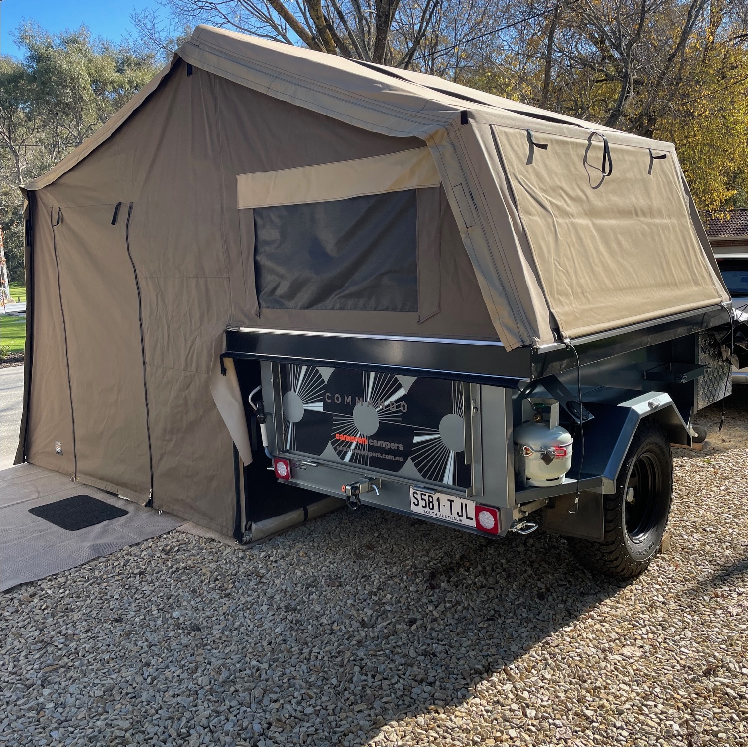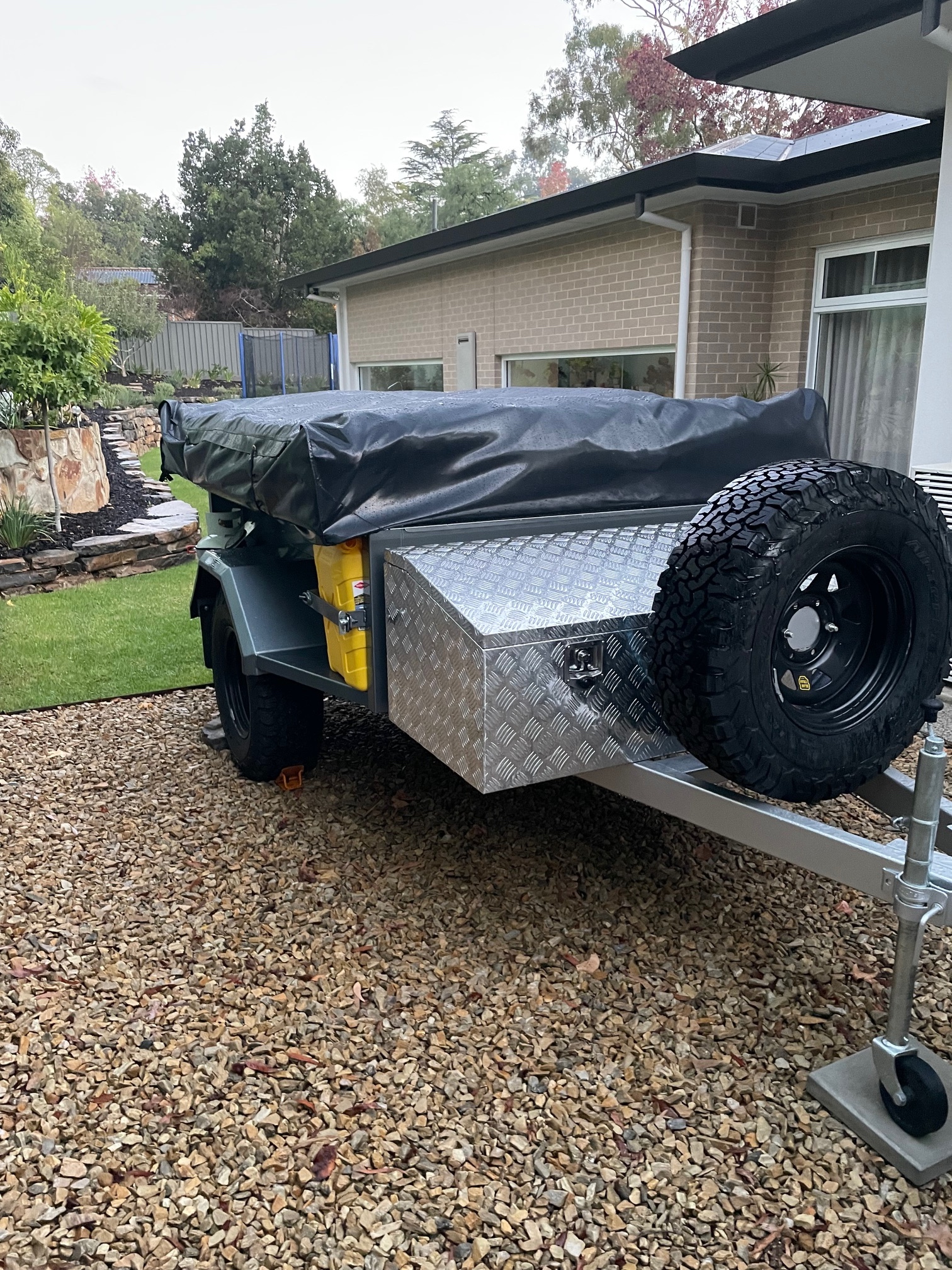 - Commando Water Package – 1x 60 Litre tank fitted with metal stone-guard and hand pump with metal bracket for pump and filler bracket welded on trailer. Includes basin and rack.