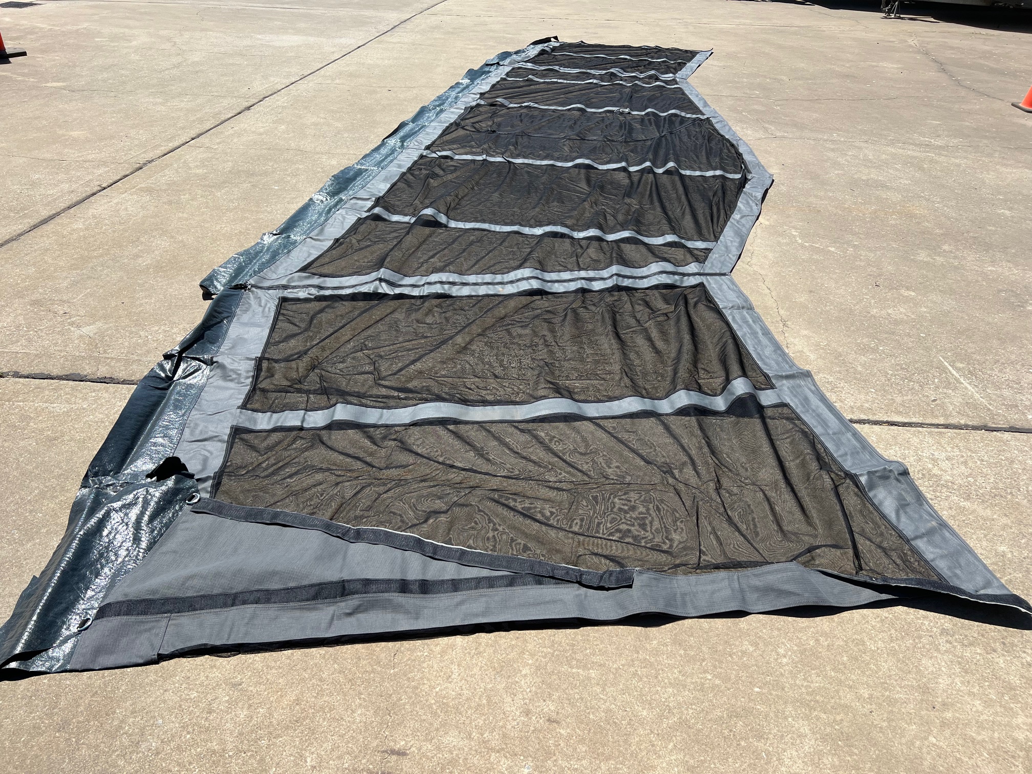 Gray canvas with mesh windows. Used but in good condition, no holes. 3 wall panels zipped together.