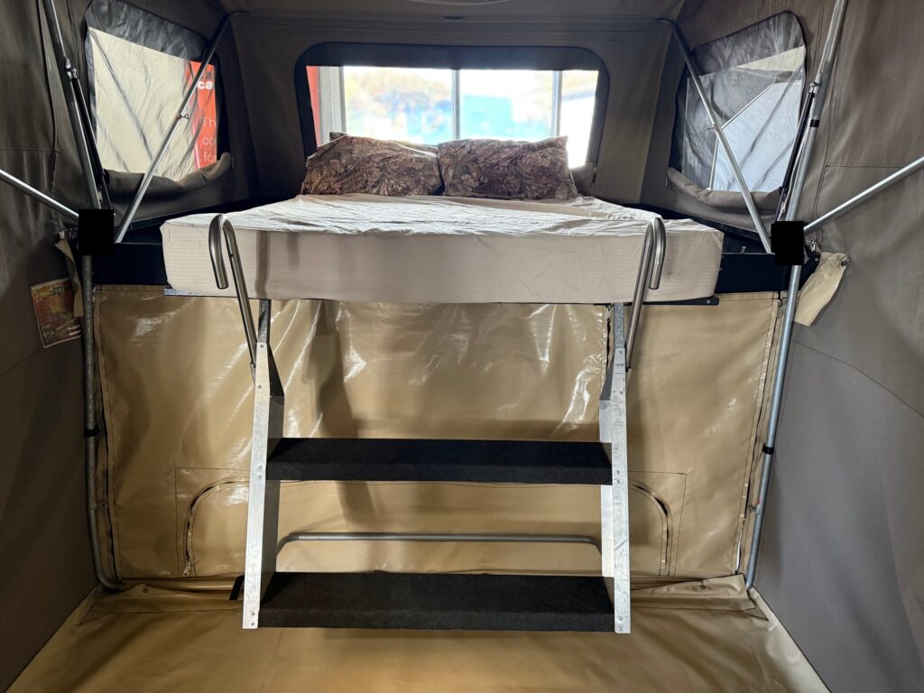 Our clever patented Easy Tent relies on our integrated poles technology for strength, quick set up and easy pack up. You simply park, swing away the framed dust cover for a quick awning over the kitchen, pull out the tent, and lock into place. It’s that easy!